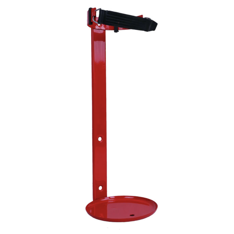 Produkt wykonany z metalu, malowany proszkowo na czerwono, co zwiększa jego widoczność. Gumowa opaska mocująca zapewnia dodatkowe bezpieczeństwo, a talerzowa podstawa stabilizuje gaśnicę.