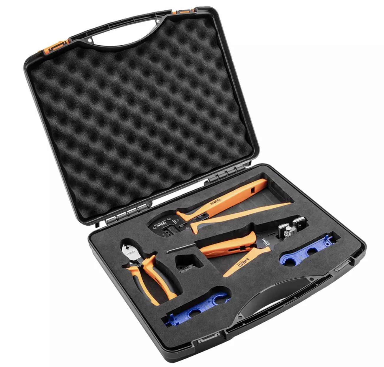 W zestawie znajdują się: ściągacz izolacji, zaciskarka, klucze oraz obcinak kabli, a także walizka do przechowywania.